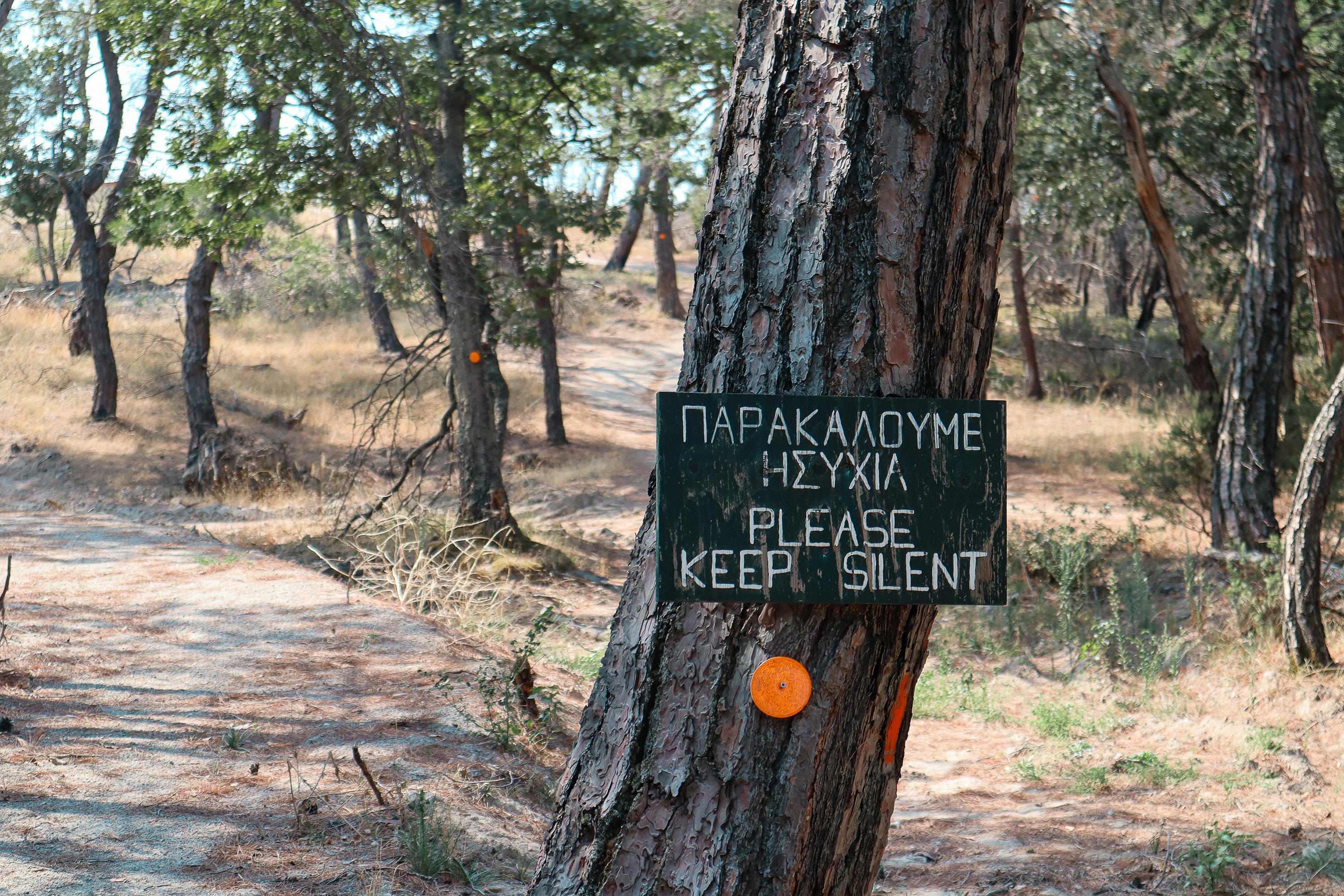 A ‘Keep Silent’ sign on the path to the bird observatory in the Dadia Forest, September 2024