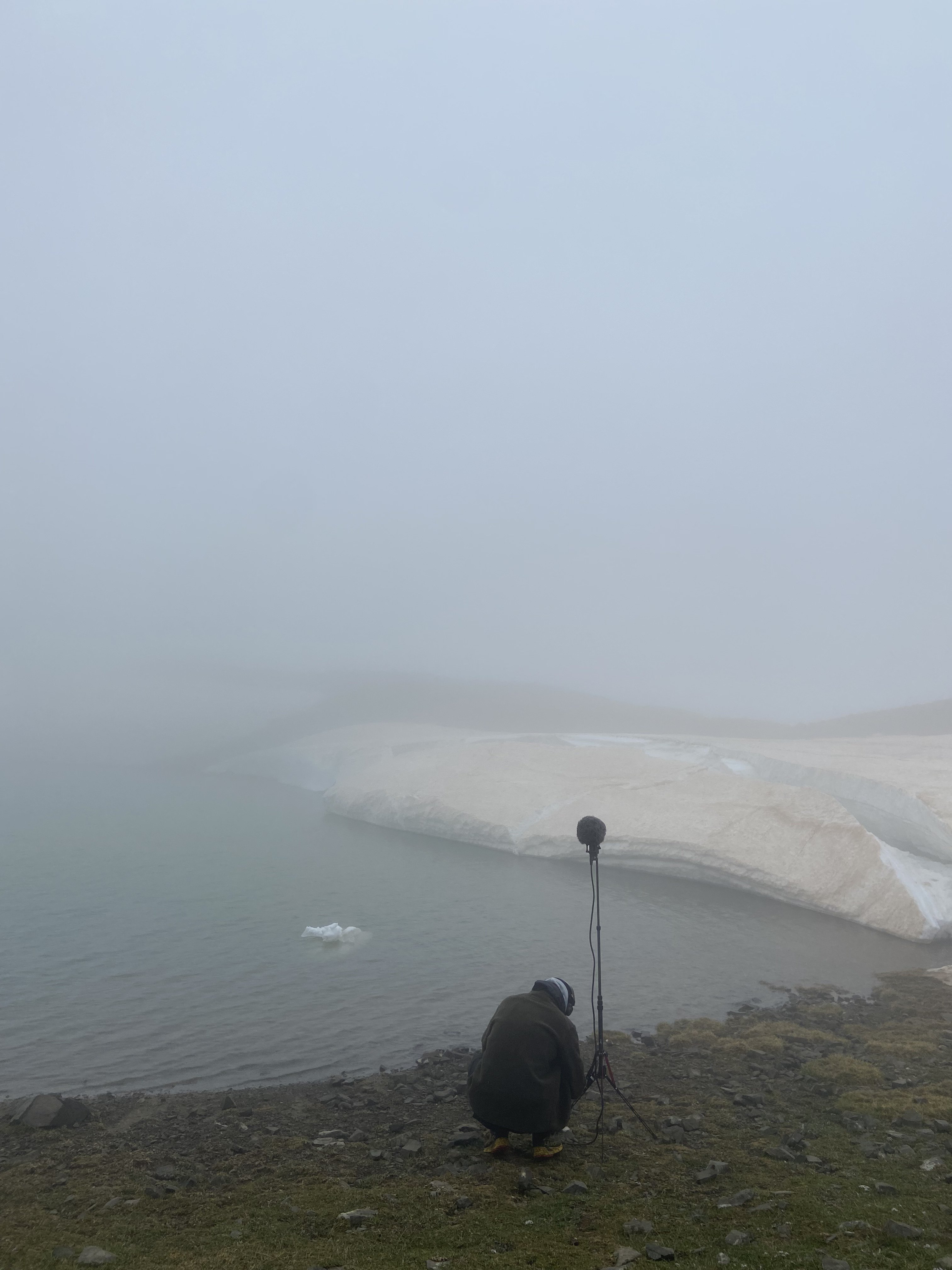 The hydrophone is immersed in the cold waters of the Gistova glacial lake at 2,353 metres altitude. A delicate sound comes through the headphones, as if the water is lighter, more crystal-like up here. It is a fairly windy day and small waves ripple the tiny lake’s surface. From time to time the gentle current carries the hydrophone onto a pebble, the impact producing a crackling sound that peaks and saturates the recording. I will need to ‘clean’ this later in the studio.